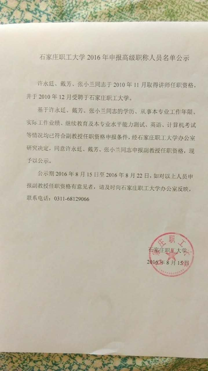 日,在石家庄职工大学对许永廷、戴芳、张小兰的职称申报材料进行公示,经公示无异议,同意推荐, 特此证明。